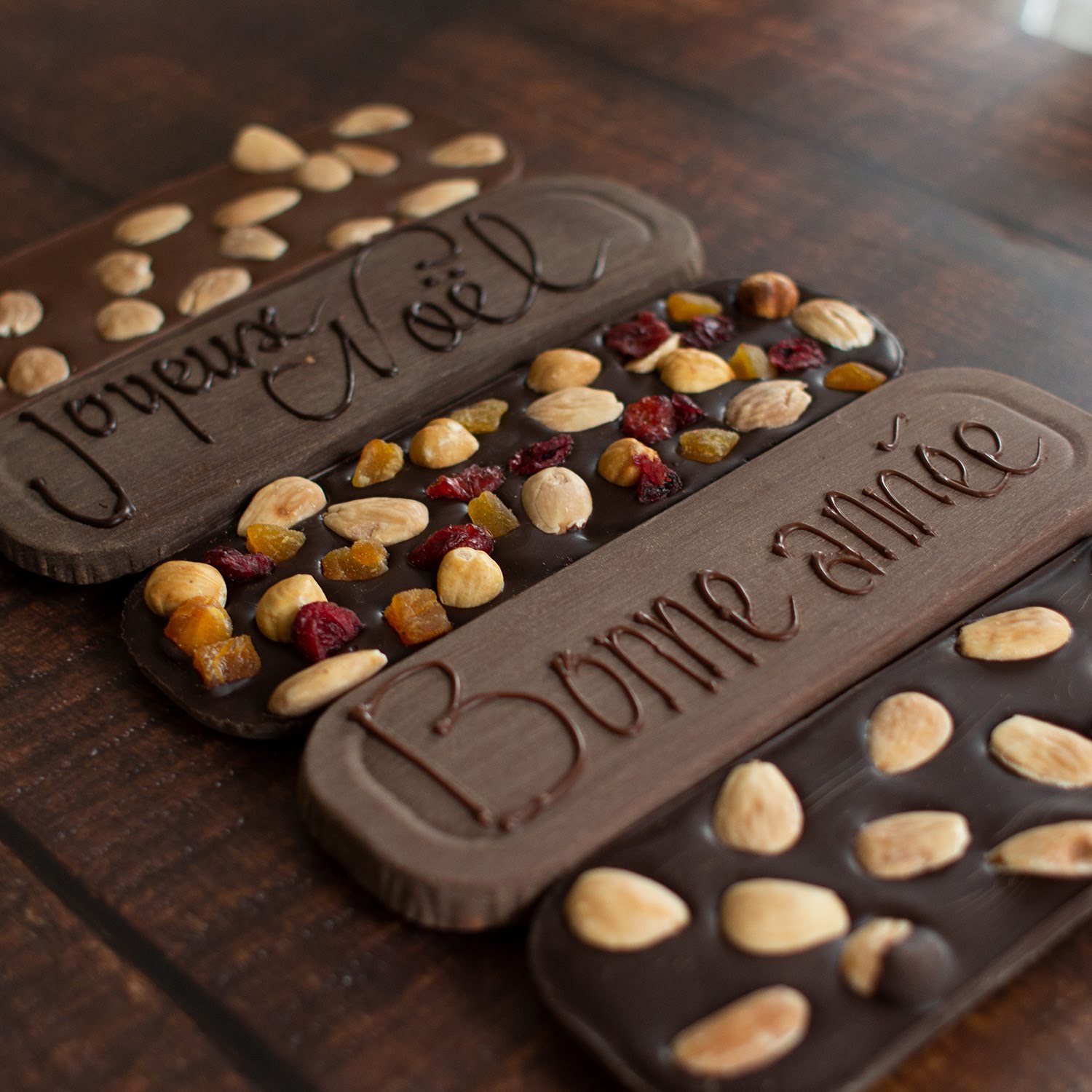 Une tablette de 80g de chocolat noir 57% ou chocolat au lait 39% brossée pour un aspect bois réaliste et une inscription personnalisée pour coller à vos évènements et célébrations.